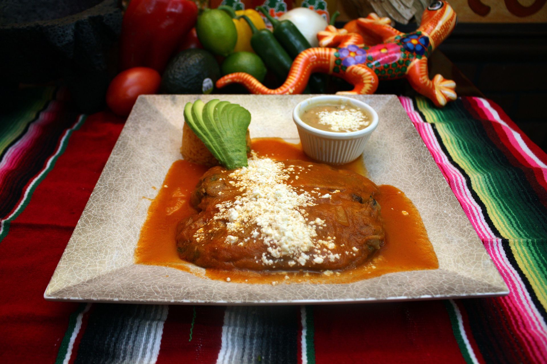 Roasted poblano peppers stuffed with cheese. covered in tomato sauce. Served with avocado, rice and beans.