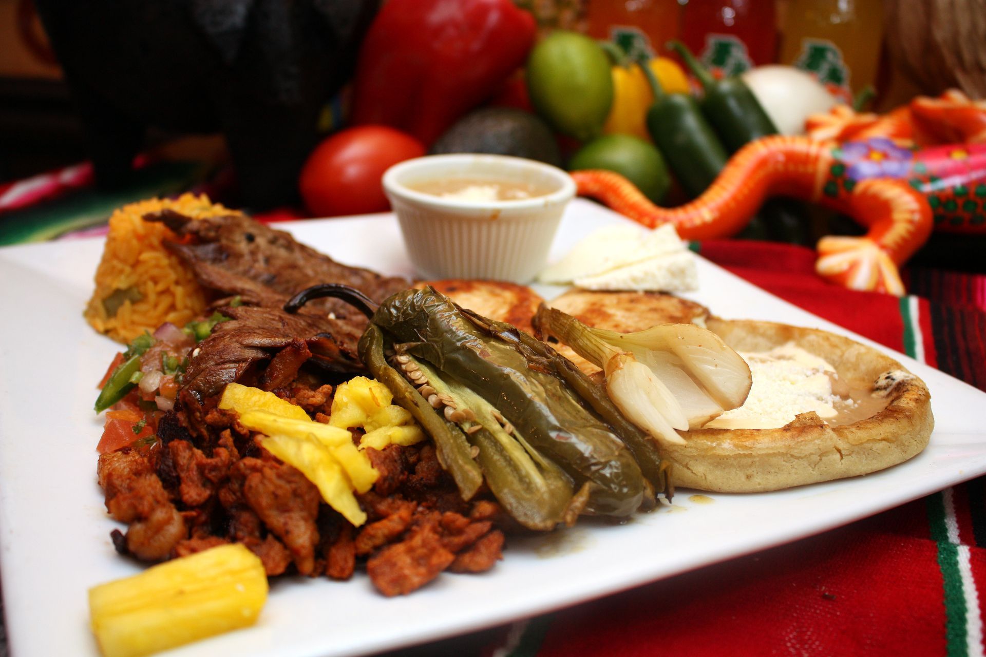 Chopped grilled steak, pork chops, bacon, bell peppers, onions, mushrooms, Chihuahua cheese, rice, beans and tortillas.