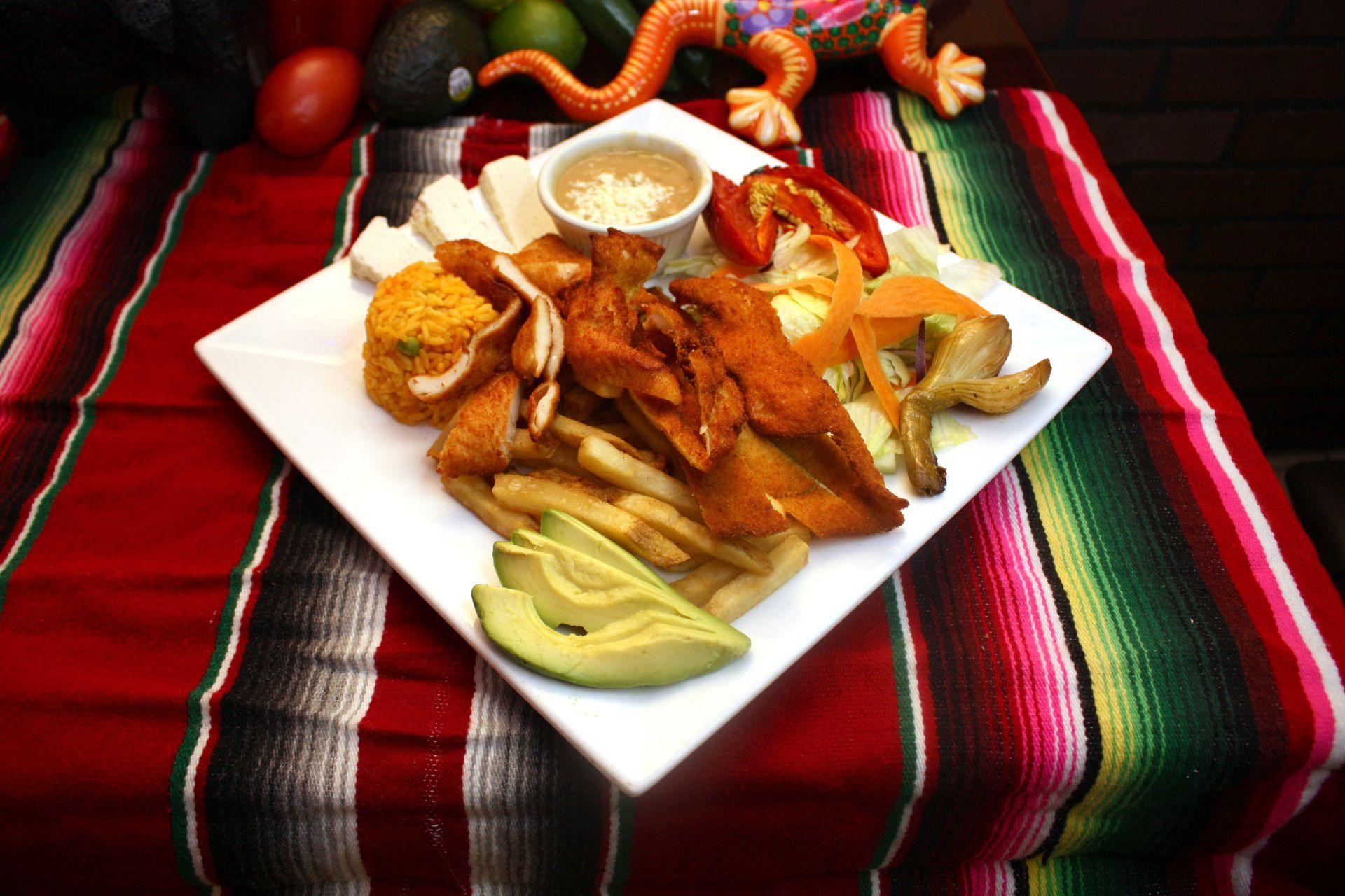 Breaded chicken or steak:Served with lettuce, tomatoes, pico de gallo, avocado, french fries and rice.