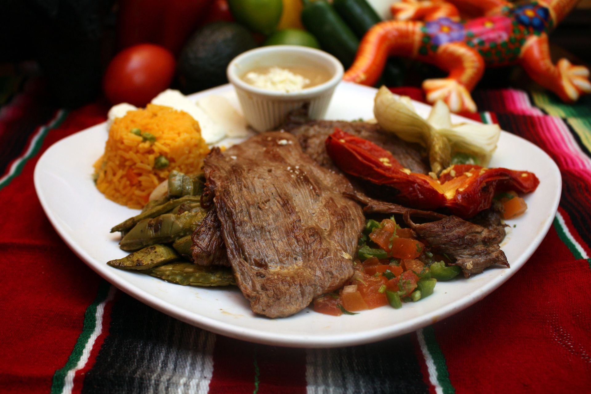 Grilled skirt steak, served with rice and beans, pico de gallo, roasted cactus and queso fresco.