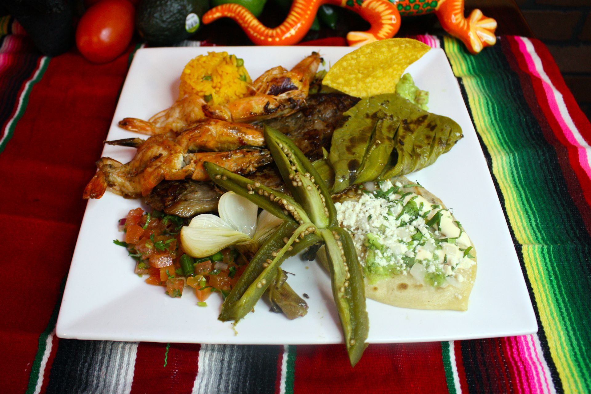 Ribeyed steak with shrimp; served with pico de gallo, guacamole, 2 mini quesadillas, rice and tortillas.