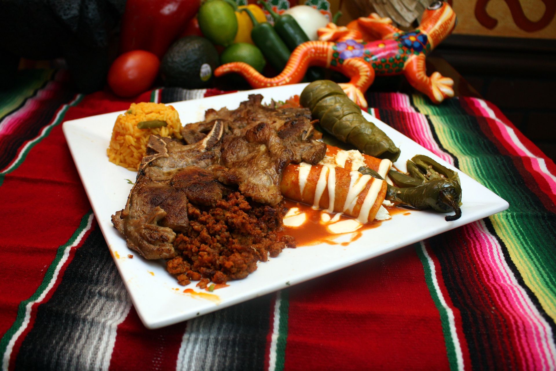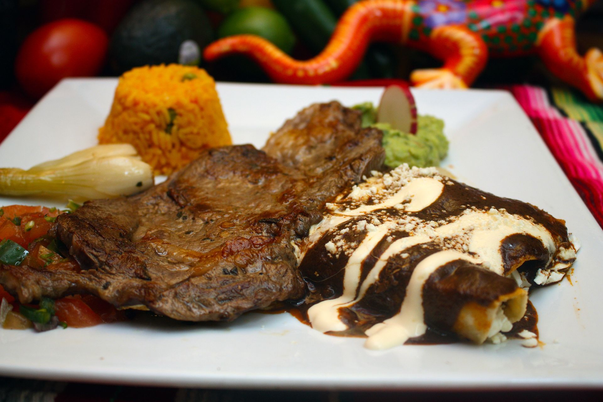 Grilled ribeye steak served with 2 cheese mole enchiladas, guacamole, pico de gallo and mexican rice.