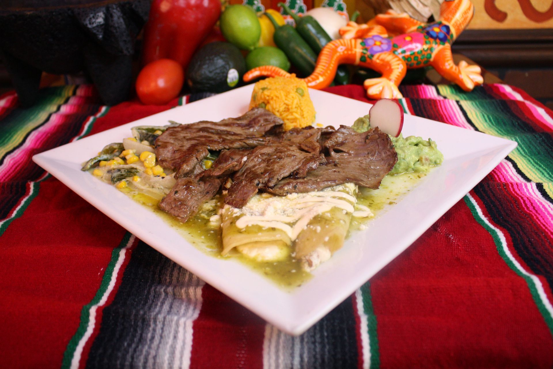 Thin grilled steak served with 2 green cheese enchiladas, rice, beans, roasted poblano peppers in a creamy sauce and guacamole.