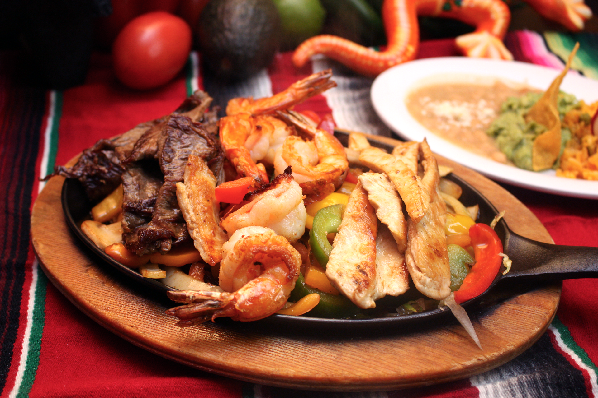 Steak, shrimp & chicken. Served over cooked onions, bell peppers, mushrooms and guacamole. Served with rice, beans and flour tortillas.
