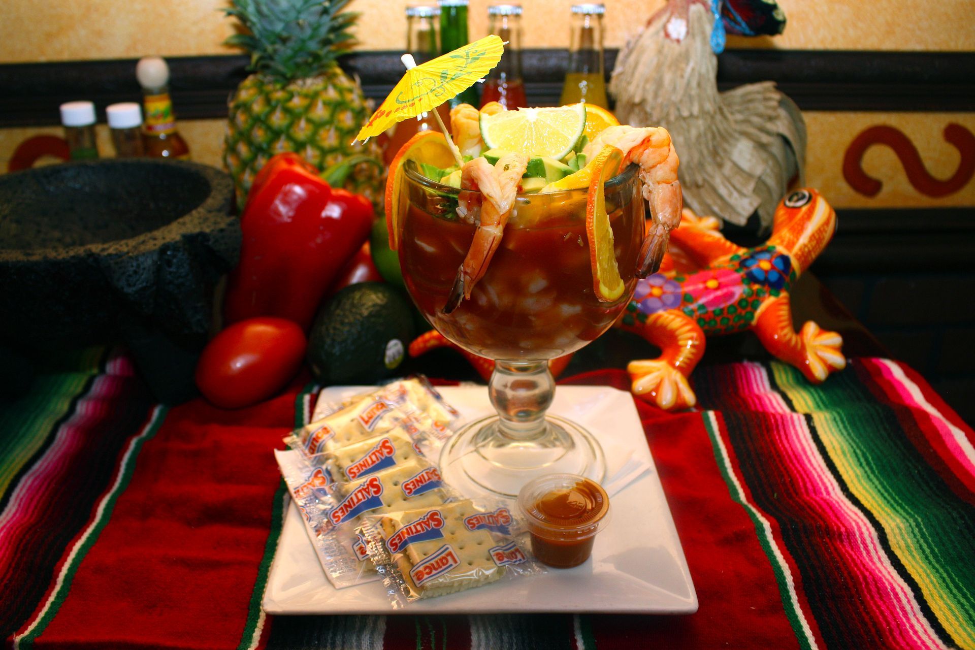 Shrimp marinated in cocktail sauce and garnished with tomatoes, onions, cilantro and avocado.