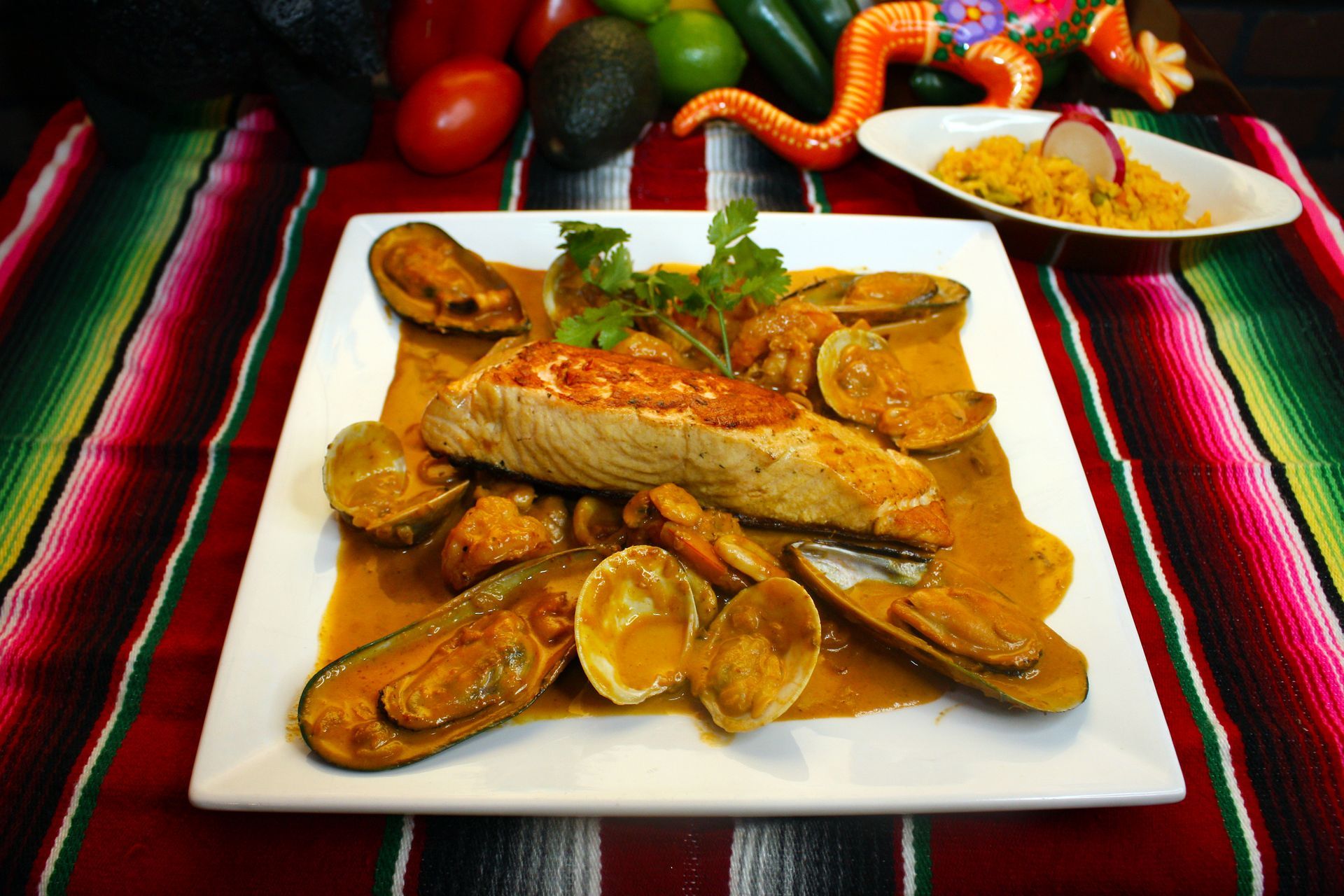 Grilled salmon, sautee shrimp, mussels, clams, seafood midley in a creamy chipotle sauce. Served with mexican rice and tortillas.