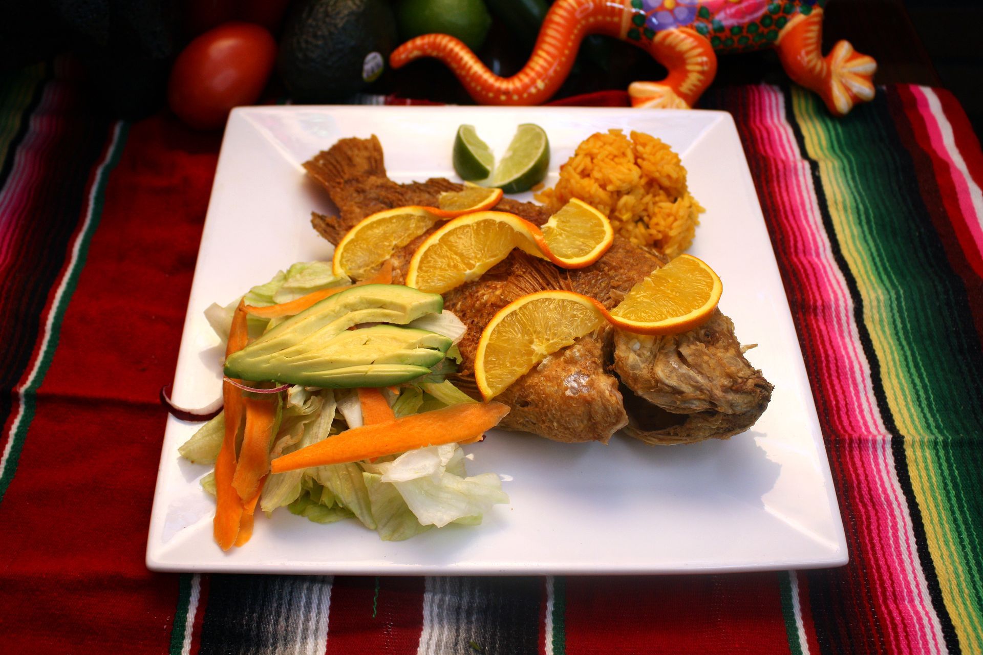 Porgie fish deep fried. Served with romaine salad, tomatoes, cucumbers, avocado and mexican rice.